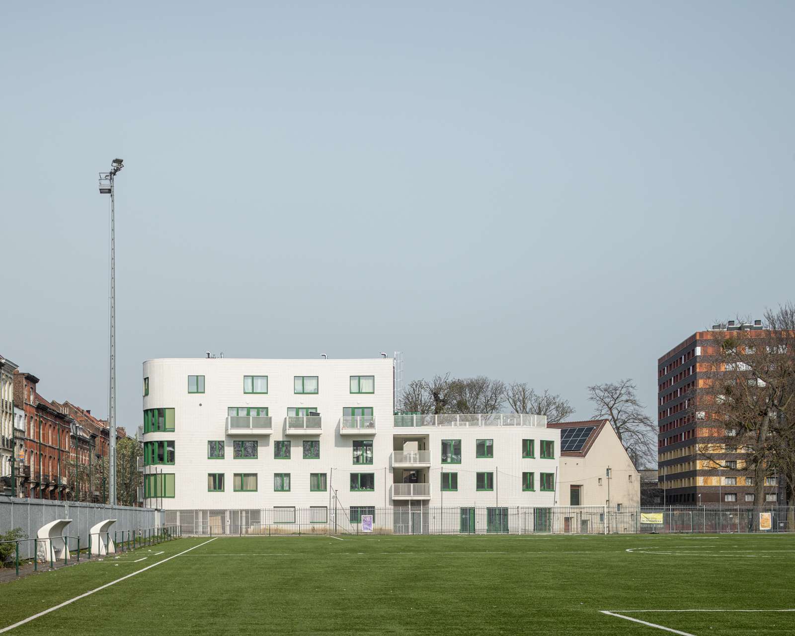 Au niveau de l’implantation, l’angle du bâtiment est transformé en une courbe permettant d’accéder de manière aisée au chemin longeant le terrain de foot. L’accès à l’intérieur d’ilôt est ainsi clair et mène vers une placette à destination du public. L’emprise au sol permet également un dégagement pour le jardin collectif.