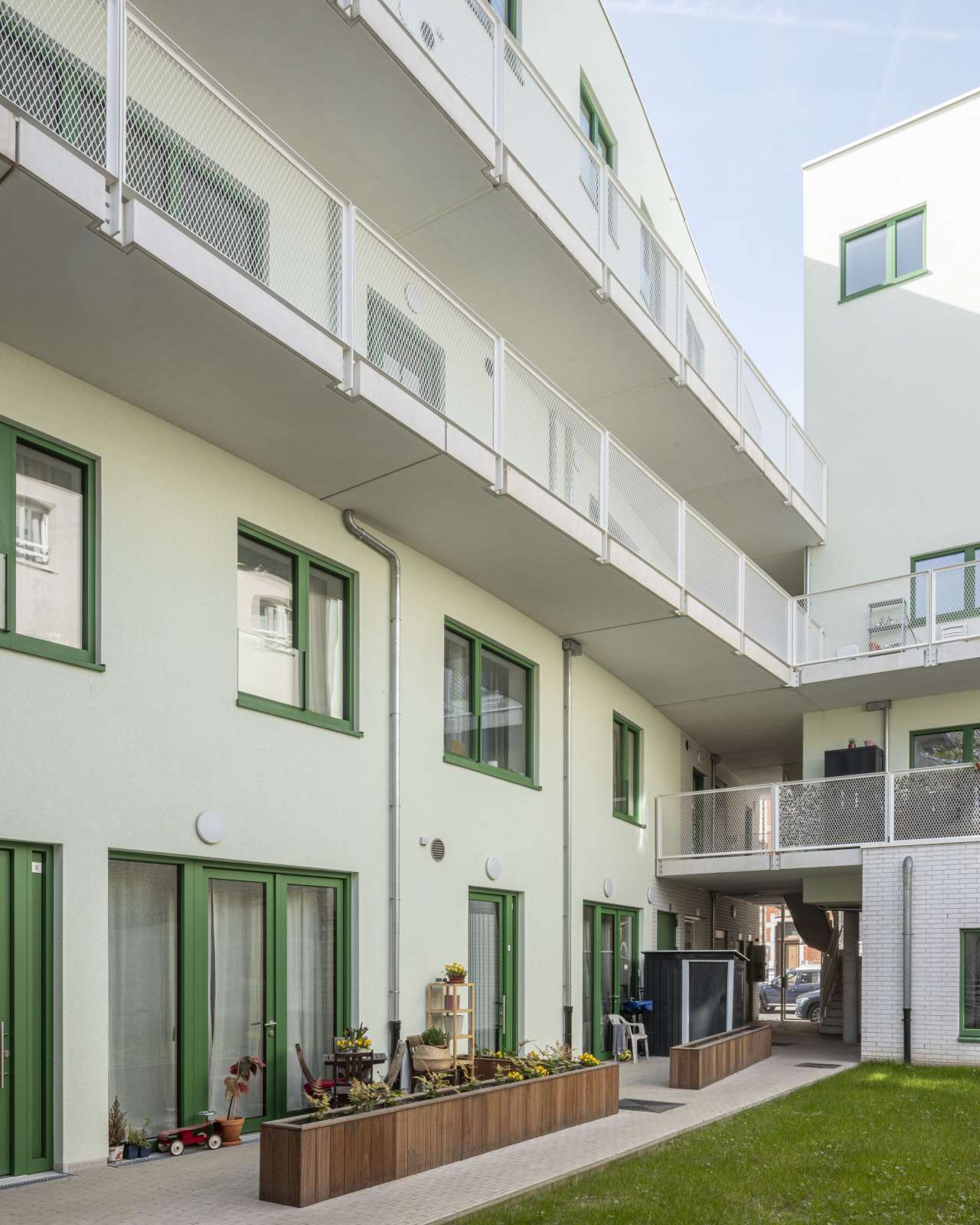 Het plan voor de appartementen is eenvoudig en duidelijk,met de mogelijkheid voor aanpassingen in de toekomst. Het gaat telkens om doorzonappartementen die beschikken over een buitenruimte. Op het dak wordt een gemeenschappelijke ruimte gecreëerd, toegankelijk via de loopbruggen tussen de verschillende gebouwdelen.