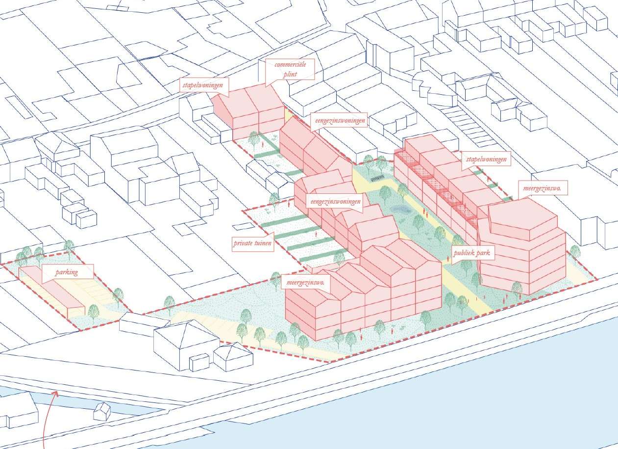 Het masterplan vertaalt deze oefening naar een heldere en doordachte inplanting voor een gemengd programma van ééngezinswoningen, meergezinswoningen en een handelsgelijkvloers aan de vaart. Binnen het geldende juridische en ruimtelijke kader (o.a. RUP) fungeert kwalitatieve, gedeelde en publieke open ruimte als structurerend principe. Zo ontstaat een gedragen en haalbaar toekomstbeeld dat een sterke ruimtelijke identiteit koppelt aan concreet ontwikkelingspotentieel.