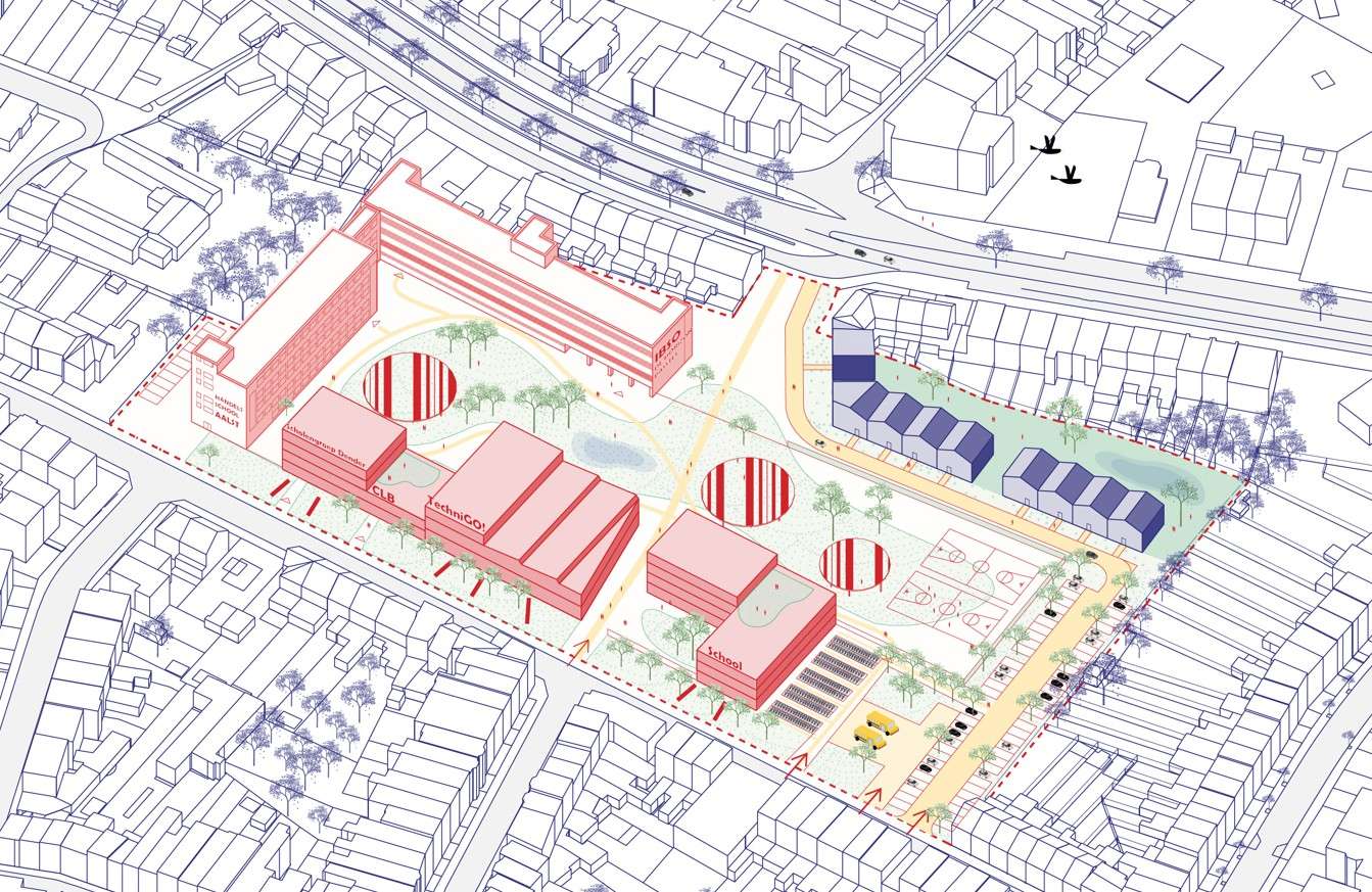 GO! Campus Voorstad huisvest verschillende onderwijsinstellingen en vormt de belangrijkste campus van de regio. PTA ontwikkelde een masterplan om de campusgedachte te optimaliseren en verschillende uitdagingen aan te pakken. Centraal stond het ruimtelijk en stedenbouwkundig onderzoek voor de inplanting van een nieuwbouwvolume van 5.000 m², ter vervanging van een asbesthoudend gebouw. Dit creëert ruimte voor de verhuis van GO! Handelschool Aalst en het CLB naar de site.